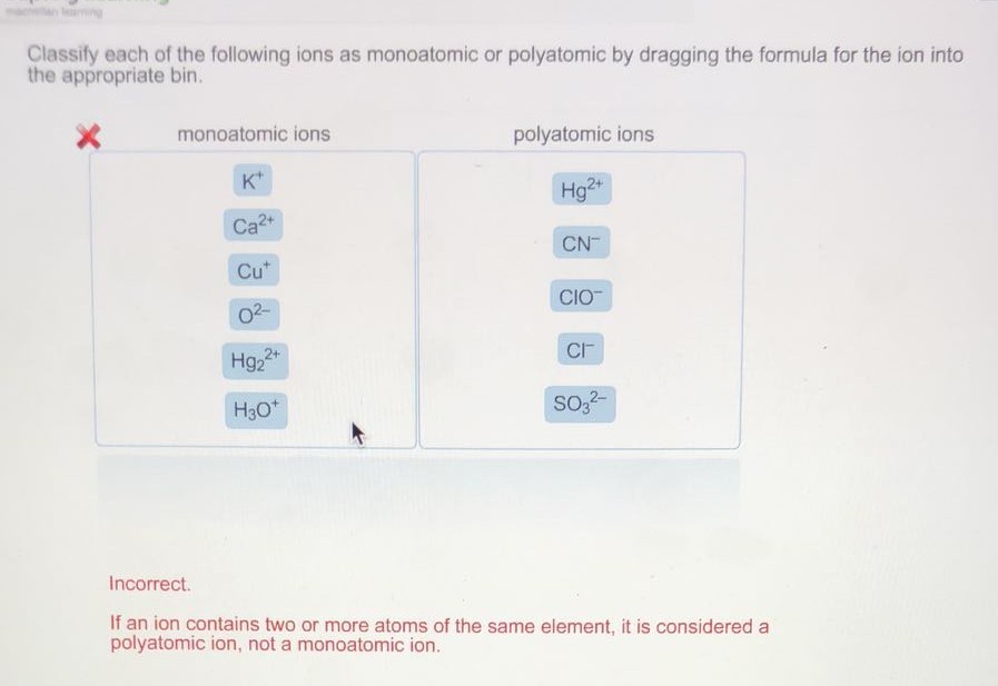 Monoatomic ions polyatomic ions 2 2 Cut o2 Hg2 H30 CN- CIO CI- so32 2 Incorrect. Na CL ClO ClO₃. Feedback Monoatomic ions Polyatomic ions Monoatomic ions contain only one atom while polyatomic ions consist of more than one atom held together by covalent bonds.