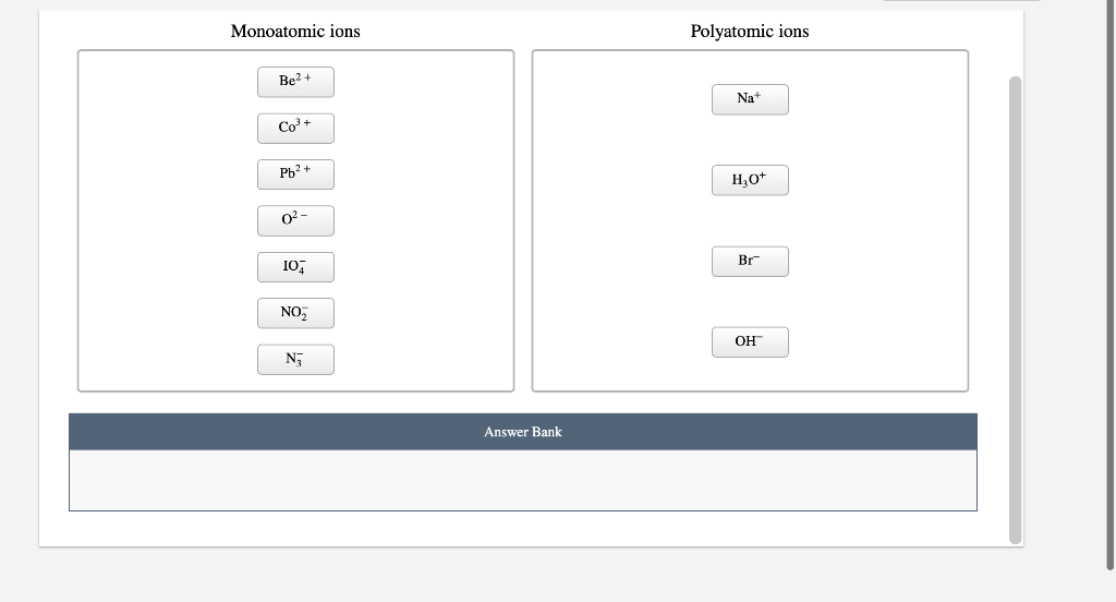 Groups of covalently bonded atoms that do not come apart. Examples for monatomic ions are Na Ca 2 K Al 3 and Fe 3. Classify each of the following ions as monoatomic or polyatomic by dragging the formula for the ion into the appropriate bin.